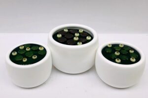 Here’s a photo of a recent copyrighted design…Inspired by dwarf water lilies growing in a used crucible in our garden.